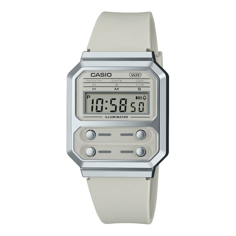 Satisfaça seu amor pelo vintage com a versão monocromática de um relógio premiado da Casio. Em homenagem ao F-100, o primeiro relógio da Casio projetado com uma caixa de resina, a linha A-100 comemora os icônicos quatro botões frontais, adicionando componentes metálicos de estilo vintage, criando a versão atualizada de um verdadeiro clássico. Com estilo retrô, mas repleto de funcionalidade contemporânea, este relógio possui cronômetro, calendário e resistência à água para uso diário e, é claro, uma luz de LED para uma fácil leitura sob qualquer iluminação.