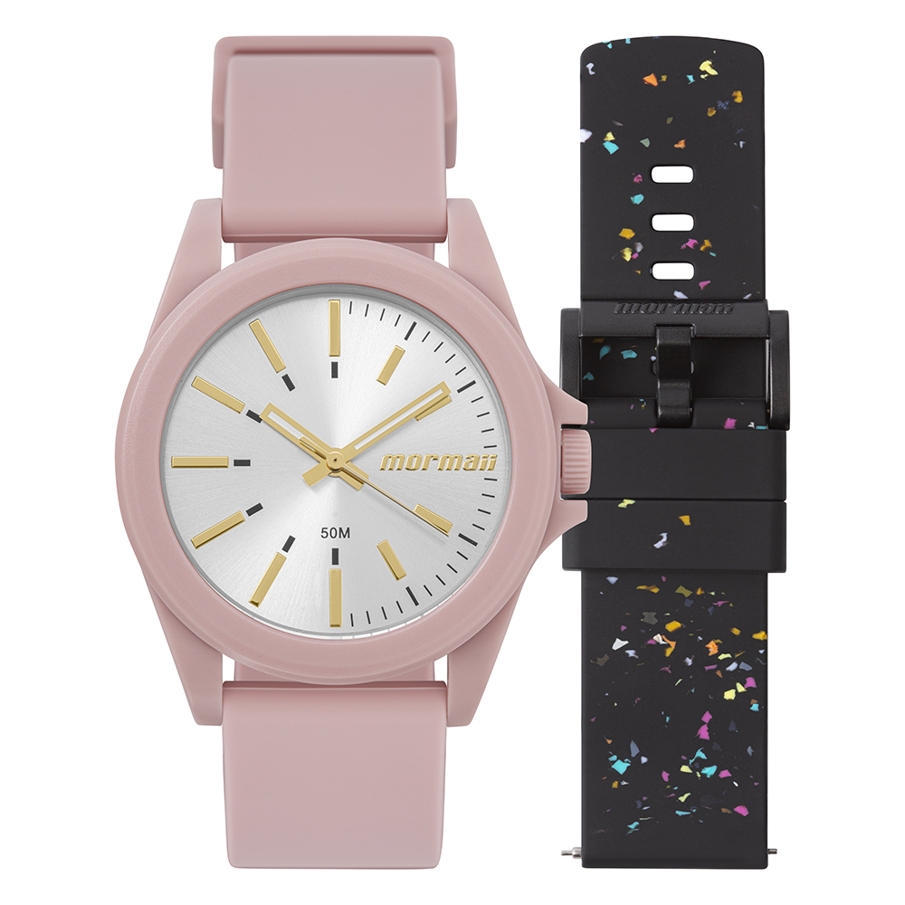 Além do design minimalista e atual, o relógio acompanha uma pulseira extra preta com partículas coloridas, permitindo variar o look com um simples toque. Ideal para quem gosta de personalizar o visual e destacar a própria identidade.