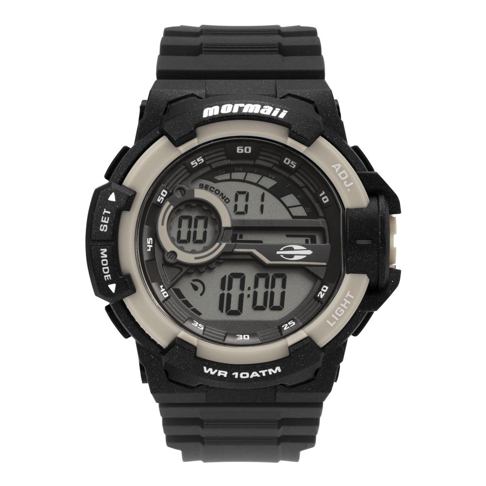 Relógio Mormaii Wave, agora com nova cor no aro externo! ideal para os surfistas, ele é feito em polímero preto, com detalhes em cinza, leve e confortável; e conta com maquinismo digital LCD positivo e luz noturna para ambientes escuros, o que facilita a leitura das horas em qualquer lugar. Além disso, tem resistência à água de 100 metros e vem com as funções de calendário, cronógrafo, alarme, cronômetro e dual time. Tamanho de caixa 53mm
