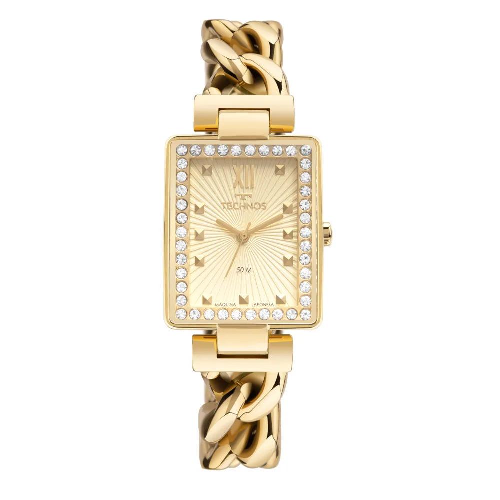 O Relógio Technos Feminino Elos Dourado - 2035MXT/1D é a escolha perfeita para quem busca um acessório elegante e imponente. Seu design retangular com caixa de 31 mm se destaca pelo aro cravejado com cristais, criando um visual glamouroso e sofisticado.