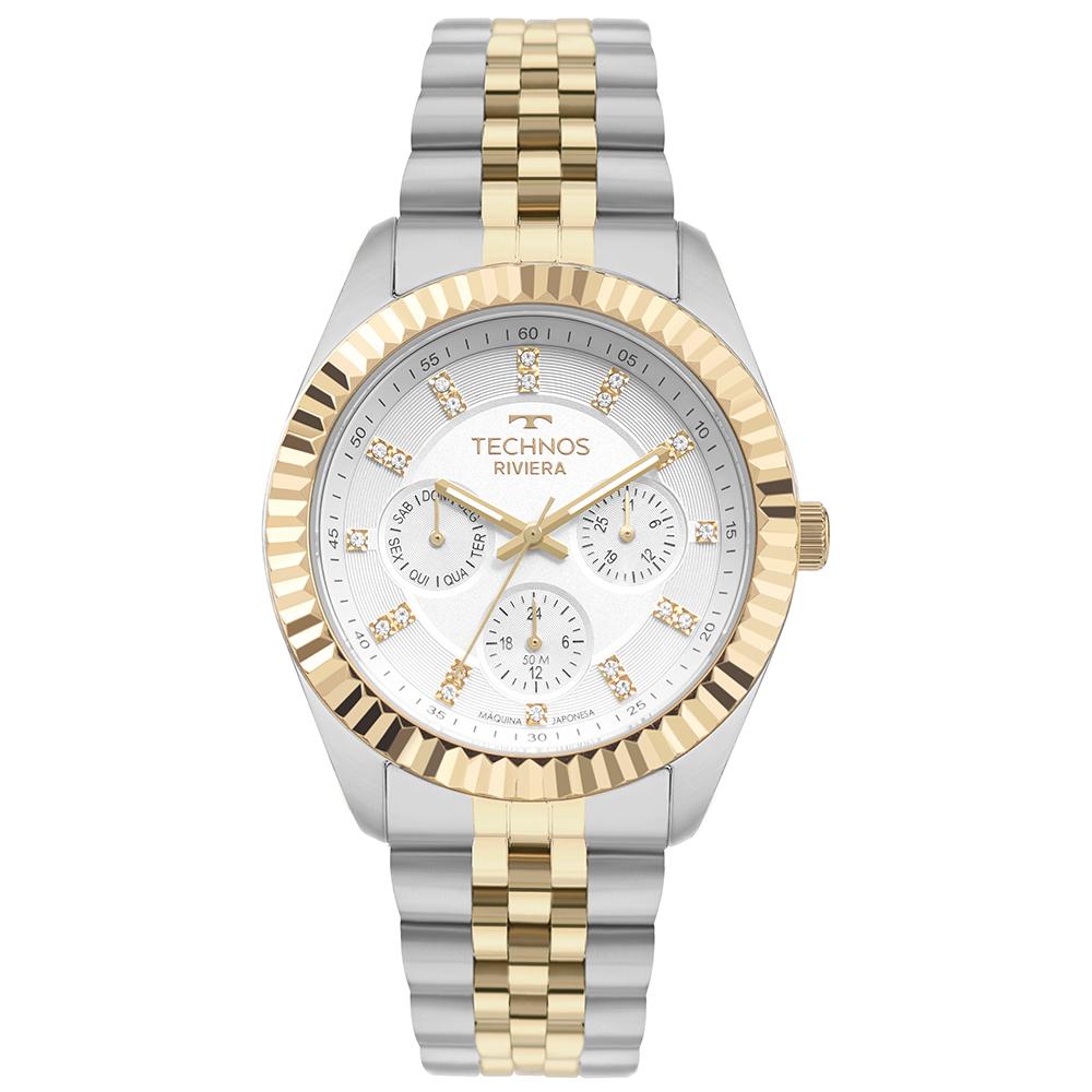 Relógio Technos Riviera feminino com design clássico, pulseira de aço inoxidável em 7 links e aro externo corrugado. Seu mostrador conta com assinatura de linha, aplicação de pedras nos marcadores de hora e aro interno com marcação dos minutos. Produto 100% em aço inoxidável, com máquina quartz japonesa Miyota multifunção e resistência à água de 50 metros