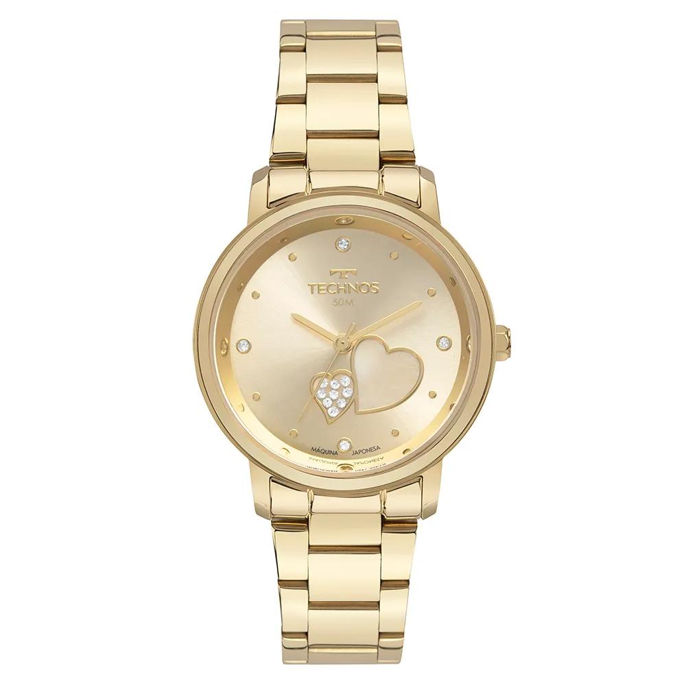 Relógio Technos Trend com design temático. Ele apresenta mostrador com aplicação de corações em pedras e efeito perolado, além de pedras aplicadas nos marcadores de hora. Produto 100% em aço inoxidável, com máquina quartz Japonesa Miyota e resistência à água de 50 metros.