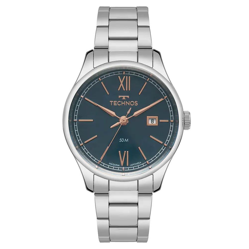 Relógio Technos Executive com design clássico e elegante numeração romana nas posições de 6 e 12 horas. Ele ainda apresenta a sofisticada lente com acabamento abaulado. Produto 100% em aço inoxidável, com máquina quartz japonesa Miyota, calendário e resistência à água de 50 metros.