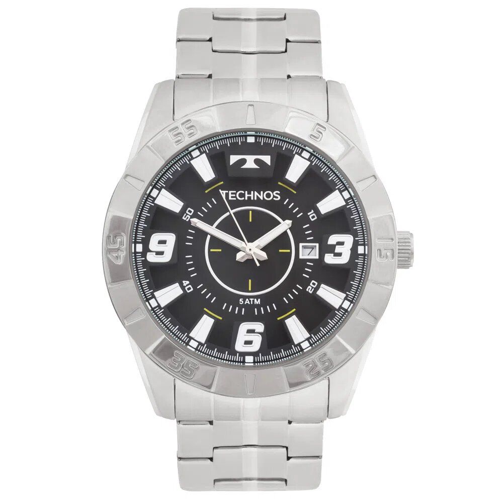 Relógio Technos masculino com caixa e pulseira de aço. Este modelo possui características esportivas. Com banho prata, o aro proeminente e o vinco nos elos centrais da pulseira são atributos fortes. O mostrador preto traz calendário e indexes em camadas tridimensionais. Modelo resistente a água até 50 metros.