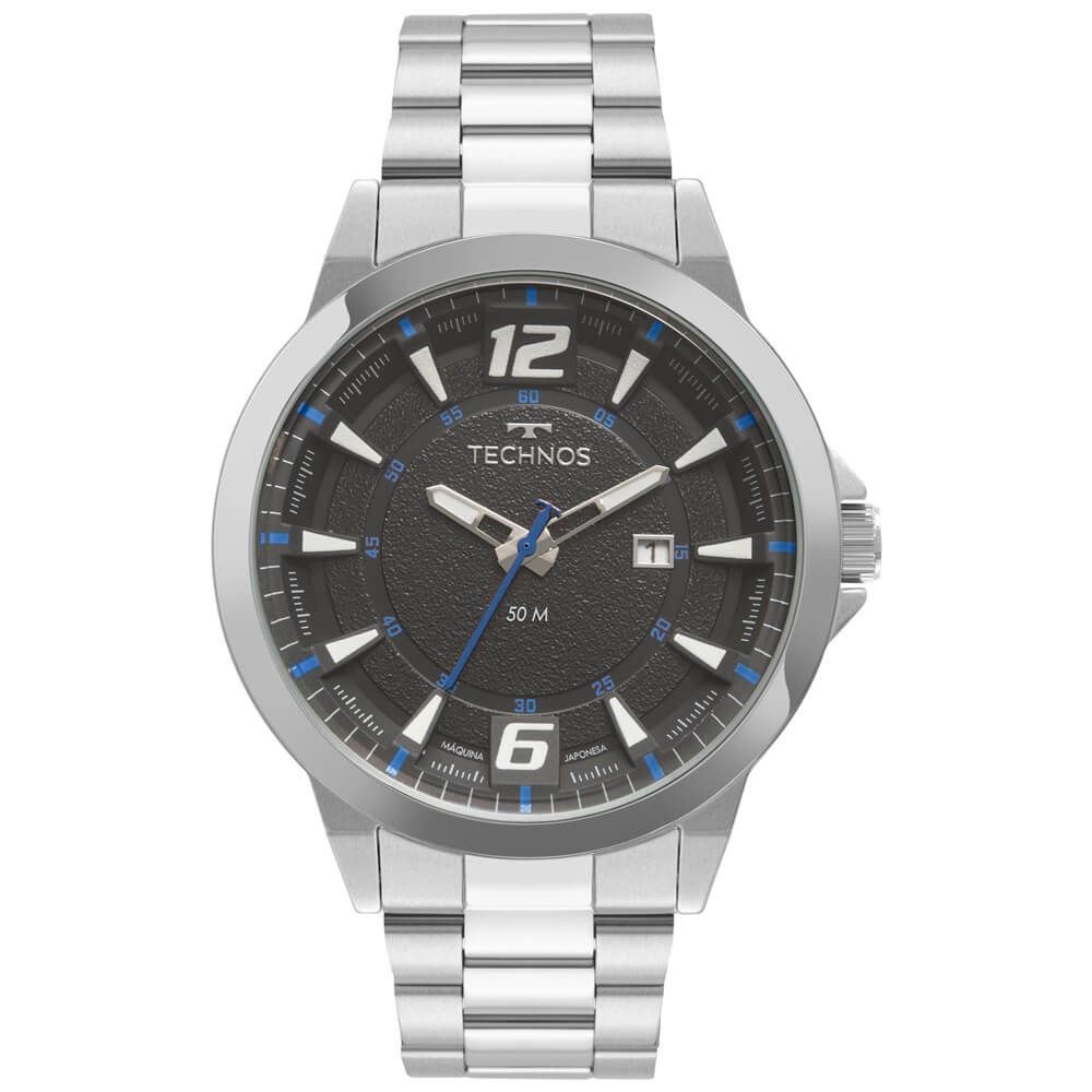 Relógio Technos masculino com caixa e pulseira de aço, modelagem esportiva com toque de cor no mostrador e design com referências automobilísticas. Feito para os que gostam de modelos clássicos com toque esportivo. Resistente à água em até 50 metros.