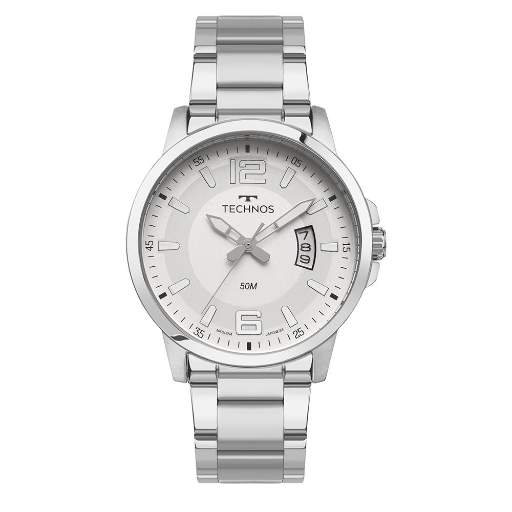 Relógio Technos Racer com design esportivo atemporal. Seu mostrador de fácil leitura conta com números grandes nas posições de 6 e 12 horas e aro interno com marcações dos minutos. Produto 100% em aço inoxidável, com máquina quartz japonesa Miyota, calendário e resistência à água de 50 metros.