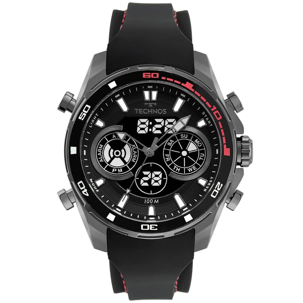 Relógio Technos Digiana masculino com caixa de aço inox em banho grafite, pulseira de silicone preta, aro com marcações, módulo digital e maquinismo analógico. Seu mostrador possui detalhes em camadas, dando profundidade à peça, e sua caixa é robusta, o que transmite a essência imponente do relógio. Possui detalhes em vermelho, resistência à água de 10 ATM e tamanho de caixa 48mm.
